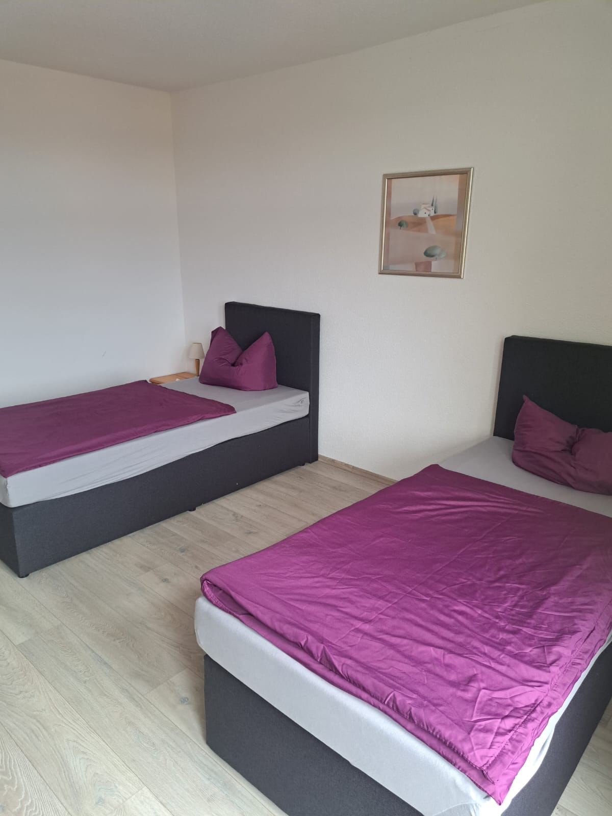 2 Personen, 1 Schlafzimmer mit 2 Boxspringbetten, Einbauküche, Badezimmer mit Dusche und WC.